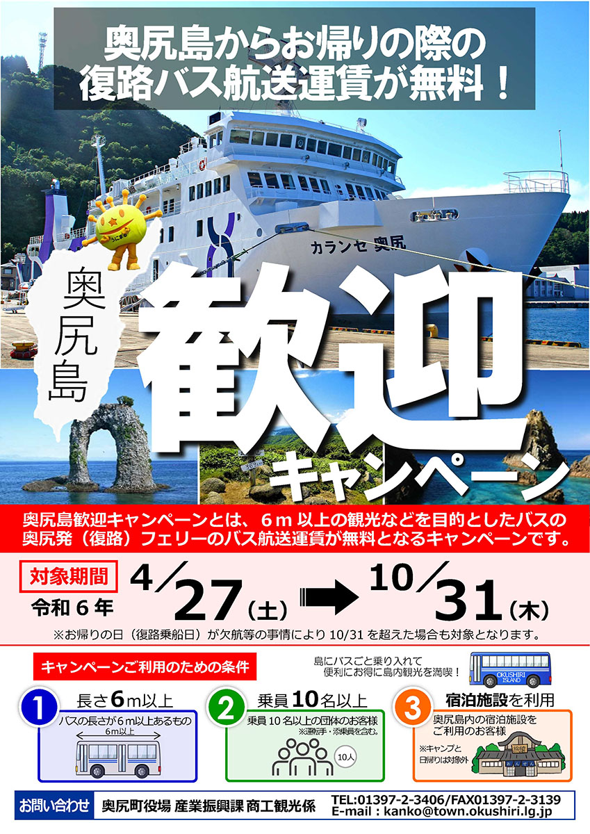 奥尻島観光歓迎キャンペーンとは6メートル以上のバスにて、10名様以上(運転手、添乗員含む)で、島内の宿泊施設に1泊以上した場合に、奥尻発の自動車航送料の復路運賃を助成するキャンペーンです。
